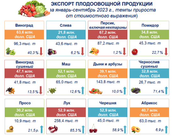 Узбекистан выручил $831 млн от экспорта плодоовощной продукции — на 9% больше, чем в январе-сентябре 2022 года.