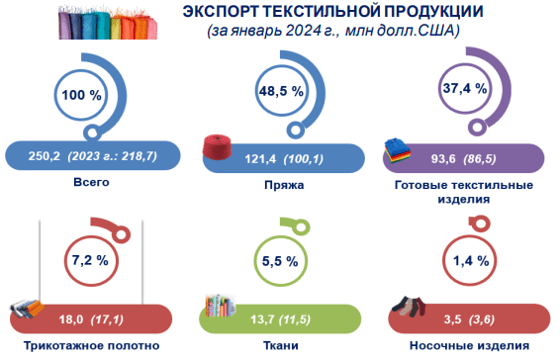 В январе 2024 года 438 видов текстильной продукции было экспортировано в 47 стран мира, — отметили в Статагентстве.