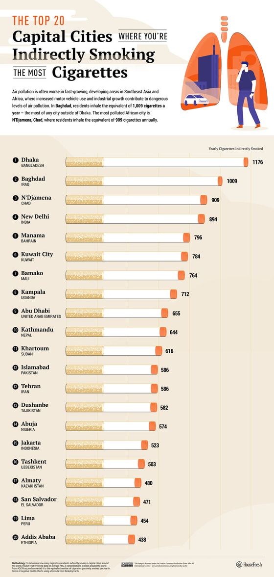 Ташкент занял 16 место в списке городов с наихудшим качеством воздуха. Лидерство отошло Дакке (Бангладеш) с 1 176 сигаретами.