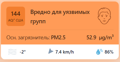 В 09:00 станция мониторинга в столице Узбекистана показывала результат в 144 AQI. Концентрация PM2.5 — в 10,6 раза выше рекомендуемого ВОЗ среднегодового значения качества воздуха.