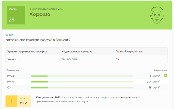 В 09:10 станция мониторинга в столице Узбекистана показывала результат в 28 AQI. Концентрация PM2.5 — в 1,2 раза выше рекомендуемого ВОЗ среднегодового значения качества воздуха.