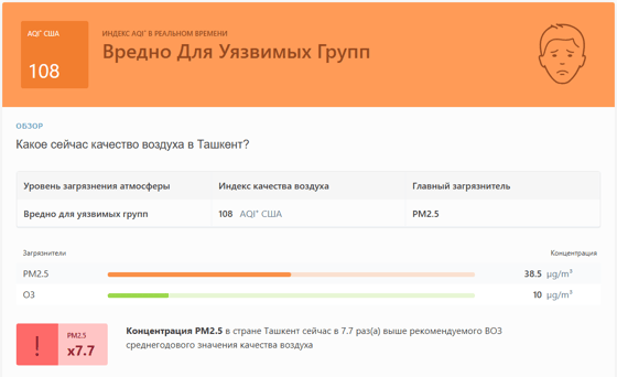 В 09:05 станция мониторинга в столице Узбекистана показывала результат в 108 AQI. Концентрация PM2.5 — в 7,7 раза выше рекомендуемого ВОЗ среднегодового значения качества воздуха.