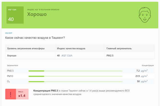 В 12:40 станция мониторинга в столице Узбекистана показывала результат в 40 AQI. Концентрация PM2.5 — в 1,4 раза выше рекомендуемого ВОЗ среднегодового значения качества воздуха.