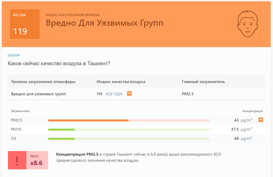 В 10:30 станция мониторинга в столице Узбекистана показывала результат в 119 AQI. Концентрация PM2.5 — в 8,6 раза выше рекомендуемого ВОЗ среднегодового значения качества воздуха.