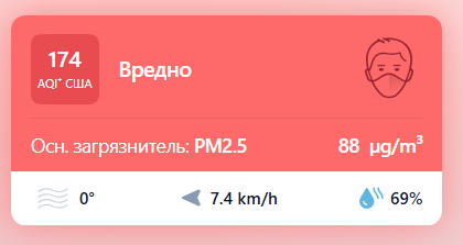 В 09:10 станция мониторинга в столице Узбекистана показывала результат в 174 AQI. Концентрация PM2.5 — в 17,6 раза выше рекомендуемого ВОЗ среднегодового значения качества воздуха.