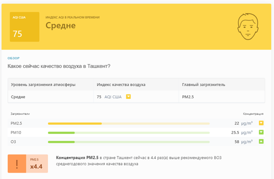 В 08:45 станция мониторинга в столице Узбекистана показывала результат в 75 AQI. Концентрация PM2.5 — в 4,4 раза выше рекомендуемого ВОЗ среднегодового значения качества воздуха.