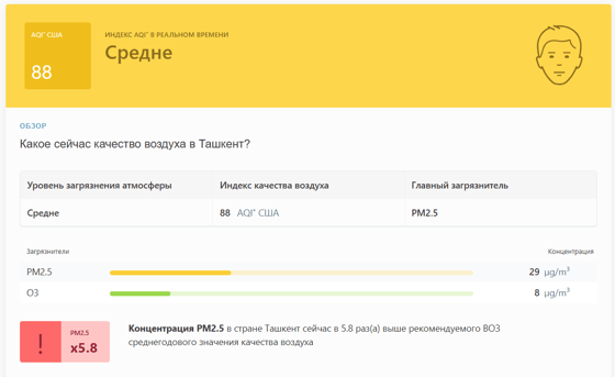 В 09:10 станция мониторинга в столице Узбекистана показывала результат в 88 AQI. Концентрация PM2.5 — в 5,8 раза выше рекомендуемого ВОЗ среднегодового значения качества воздуха.