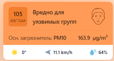 В 09:10 станция мониторинга в столице Узбекистана показывала результат в 105 AQI. Концентрация PM2.5 — в 5,2 раза выше рекомендуемого ВОЗ среднегодового значения качества воздуха.