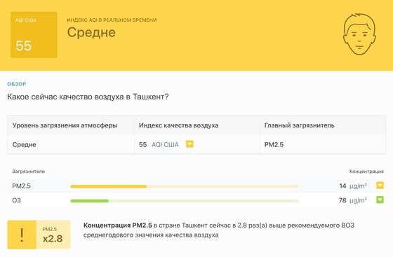 В 11:20 станция мониторинга в столице Узбекистана показывала результат в 55 AQI. Концентрация PM2.5 — в 2,8 раза выше рекомендуемого ВОЗ среднегодового значения качества воздуха.