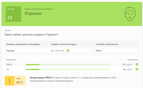 В 09:10 станция мониторинга в столице Узбекистана показывала результат в 23 AQI. Концентрация PM2.5 — в 1,1 раза выше рекомендуемого ВОЗ среднегодового значения качества воздуха.