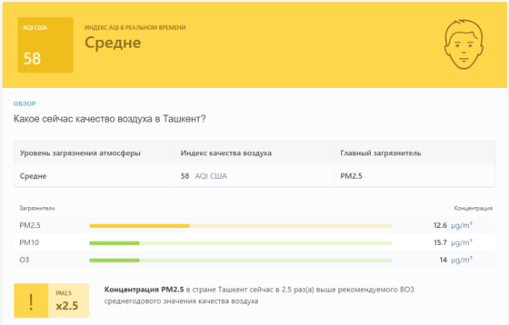 В 09:05 станция мониторинга в столице Узбекистана показывала результат в 58 AQI. Концентрация PM2.5 — в 2,5 раза выше рекомендуемого ВОЗ среднегодового значения качества воздуха.