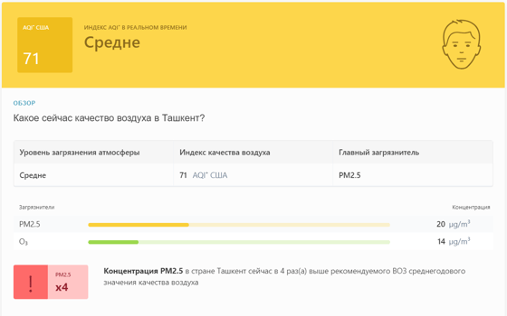 В 10:05 станция мониторинга в столице Узбекистана показывала результат в 71 AQI. Концентрация PM2.5 — в 4 раза выше рекомендуемого ВОЗ среднегодового значения качества воздуха.