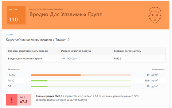 В 09:00 станция мониторинга в столице Узбекистана показывала результат в 110 AQI. Концентрация PM2.5 — в 7,8 раза выше рекомендуемого ВОЗ среднегодового значения качества воздуха.