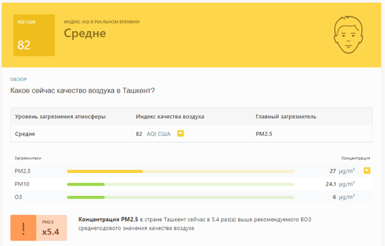 В 09:10 станция мониторинга в столице Узбекистана показывала результат в 82 AQI. Концентрация PM2.5 — в 5,4 раза выше рекомендуемого ВОЗ среднегодового значения качества воздуха.