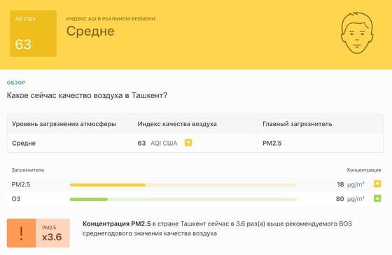 В 11:30 станция мониторинга в столице Узбекистана показывала результат в 63 AQI. Концентрация PM2.5 — в 3,6 раза выше рекомендуемого ВОЗ среднегодового значения качества воздуха.