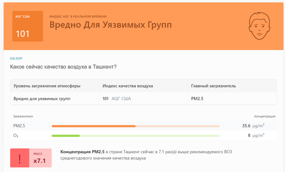 В 09:10 станция мониторинга в столице Узбекистана показывала результат в 101 AQI. Концентрация PM2.5 — в 7,1 раза выше рекомендуемого ВОЗ среднегодового значения качества воздуха.