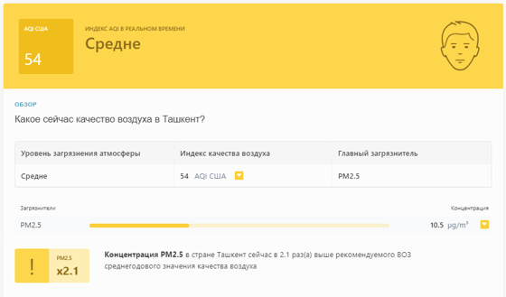 В 10:10 станция мониторинга в столице Узбекистана показывала результат в 54 AQI. Концентрация PM2.5 — в 2,1 раза выше рекомендуемого ВОЗ среднегодового значения качества воздуха.