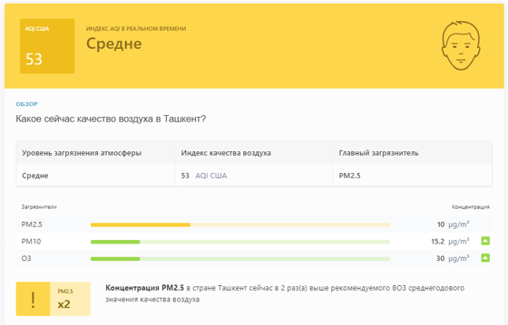 В 08:50 станция мониторинга в столице Узбекистана показывала результат в 53 AQI. Концентрация PM2.5 — в 2 раза выше рекомендуемого ВОЗ среднегодового значения качества воздуха.
