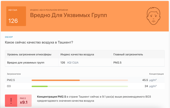 В 12:00 станция мониторинга в столице Узбекистана показывала результат в 126 AQI. Концентрация PM2.5 — в 9,1 раза выше рекомендуемого ВОЗ среднегодового значения качества воздуха.