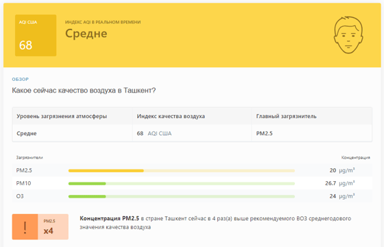 В 09:10 станция мониторинга в столице Узбекистана показывала результат в 68 AQI. Концентрация PM2.5 — в 4 раза выше рекомендуемого ВОЗ среднегодового значения качества воздуха.