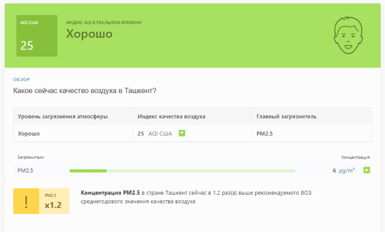 В 09:10 станция мониторинга в столице Узбекистана показывала результат в 25 AQI. Концентрация PM2.5 — в 1,2 раза выше рекомендуемого ВОЗ среднегодового значения качества воздуха.