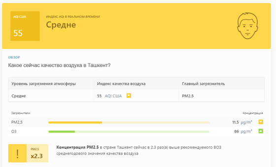 В 11:20 станция мониторинга в столице Узбекистана показывала результат в 55 AQI. Концентрация PM2.5 — в 2,3 раза выше рекомендуемого ВОЗ среднегодового значения качества воздуха.
