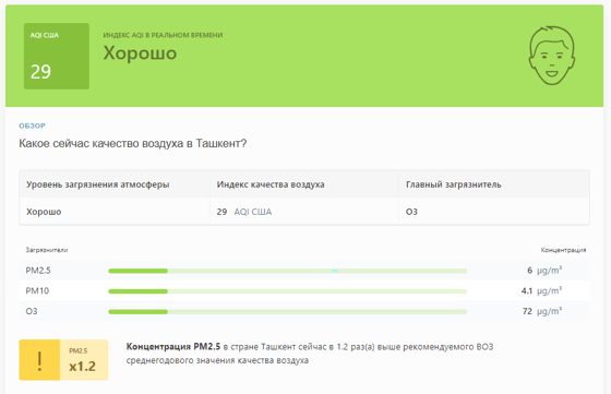 В 09:10 станция мониторинга в столице Узбекистана показывала результат в 29 AQI. Концентрация PM2.5 — в 1,2 раза выше рекомендуемого ВОЗ среднегодового значения качества воздуха.
