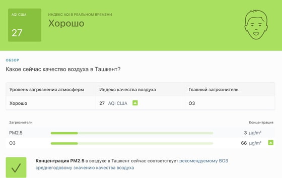 В 11:00 станция мониторинга в столице Узбекистана показывала результат в 27 AQI. Концентрация PM2.5 соответствует рекомендуемому ВОЗ среднегодовому значению качества воздуха.