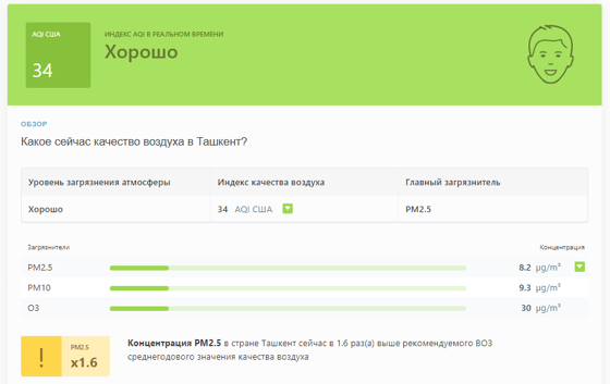 В 09:10 станция мониторинга в столице Узбекистана показывала результат в 34 AQI. Концентрация PM2.5 — в 1,6 раза выше рекомендуемого ВОЗ среднегодового значения качества воздуха.