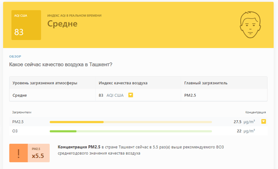 В 09:10 станция мониторинга в столице Узбекистана показывала результат в 83 AQI. Концентрация PM2.5 — в 5,5 раза выше рекомендуемого ВОЗ среднегодового значения качества воздуха.