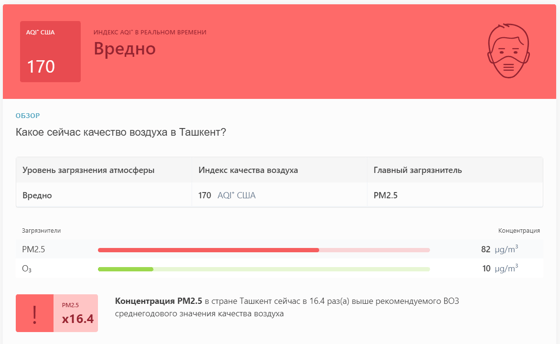 В 09:05 станция мониторинга в столице Узбекистана показывала результат в 170 AQI. Концентрация PM2.5 — в 16,4 раза выше рекомендуемого ВОЗ среднегодового значения качества воздуха.