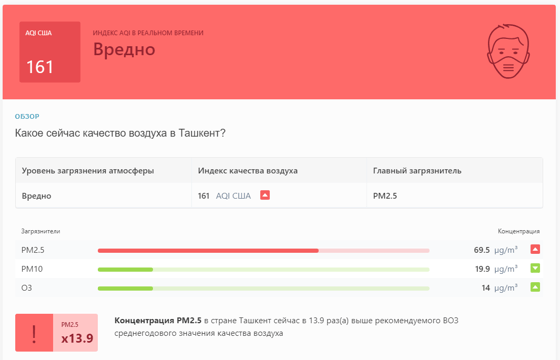 В 08:52 станция мониторинга в столице Узбекистана показывала результат в 161 AQI. Концентрация PM2.5 — в 13,9 раза выше рекомендуемого ВОЗ среднегодового значения качества воздуха.