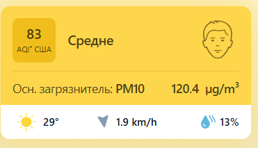 В 09:00 станция мониторинга в столице Узбекистана показывала результат в 83 AQI. Концентрация PM2.5 — в 4 раза выше рекомендуемого ВОЗ среднегодового значения качества воздуха.