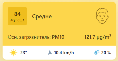 В 09:10 станция мониторинга в столице Узбекистана показывала результат в 84 AQI. Концентрация PM2.5 — в 5,3 раза выше рекомендуемого ВОЗ среднегодового значения качества воздуха.