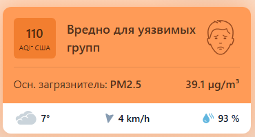 В 08:50 станция мониторинга в столице Узбекистана показывала результат в 110 AQI. Концентрация PM2.5 — в 7,8 раза выше рекомендуемого ВОЗ среднегодового значения качества воздуха.
