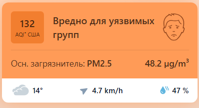 В 09:00 станция мониторинга в столице Узбекистана показывала результат в 132 AQI. Концентрация PM2.5 — в 9,6 раза выше рекомендуемого ВОЗ среднегодового значения качества воздуха.