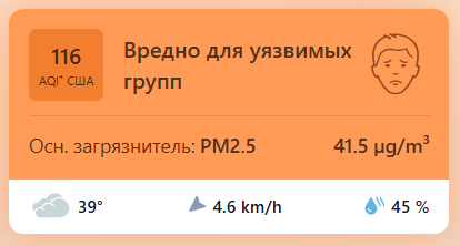 В 09:25 станция мониторинга в столице Узбекистана показывала результат в 116 AQI. Концентрация PM2.5 — в 8,3 раза выше рекомендуемого ВОЗ среднегодового значения качества воздуха.
