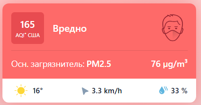 В 08:55 станция мониторинга в столице Узбекистана показывала результат в 165 AQI. Концентрация PM2.5 — в 15,2 раза выше рекомендуемого ВОЗ среднегодового значения качества воздуха.