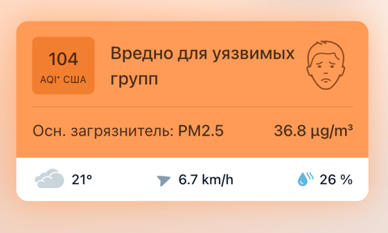 В 12:00 станция мониторинга в столице Узбекистана показывала результат в 104 AQI. Концентрация PM2.5 — в 7,4 раза выше рекомендуемого ВОЗ среднегодового значения качества воздуха.