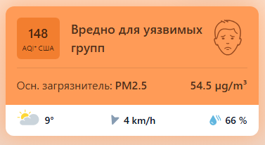 В 09:00 станция мониторинга в столице Узбекистана показывала результат в 148 AQI. Концентрация PM2.5 — в 10,9 раза выше рекомендуемого ВОЗ среднегодового значения качества воздуха.