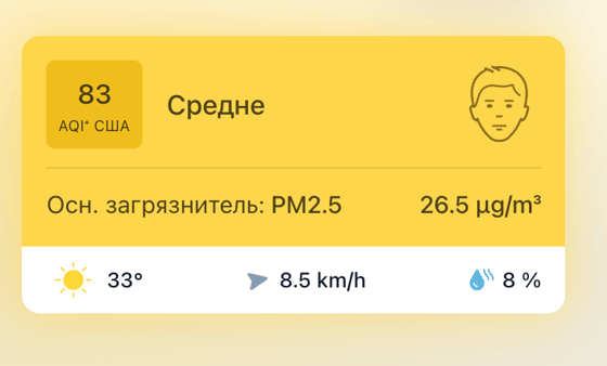 В 12:00 станция мониторинга в столице Узбекистана показывала результат в 83 AQI. Концентрация PM2.5 — в 5,3 раза выше рекомендуемого ВОЗ среднегодового значения качества воздуха.
