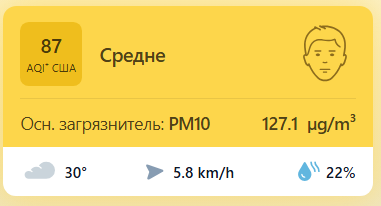 В 09:05 станция мониторинга в столице Узбекистана показывала результат в 87 AQI. Концентрация PM2.5 — в 5 раз выше рекомендуемого ВОЗ среднегодового значения качества воздуха.