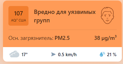В 09:00 станция мониторинга в столице Узбекистана показывала результат в 107 AQI. Концентрация PM2.5 — в 7,6 раза выше рекомендуемого ВОЗ среднегодового значения качества воздуха.