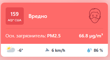 В 08:55 станция мониторинга в столице Узбекистана показывала результат в 159 AQI. Концентрация PM2.5 — в 13,4 раза выше рекомендуемого ВОЗ среднегодового значения качества воздуха.