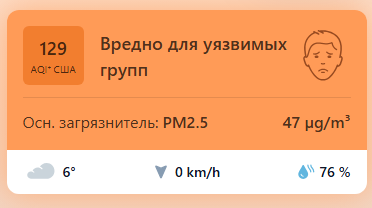 В 08:55 станция мониторинга в столице Узбекистана показывала результат в 129 AQI. Концентрация PM2.5 — в 9,4 раза выше рекомендуемого ВОЗ среднегодового значения качества воздуха.