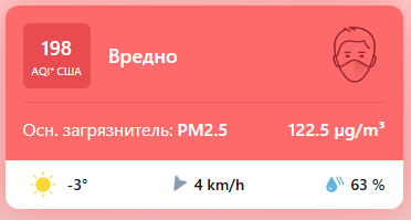 В 08:55 станция мониторинга в столице Узбекистана показывала результат в 198 AQI. Концентрация PM2.5 — в 24,5 раза выше рекомендуемого ВОЗ среднегодового значения качества воздуха.