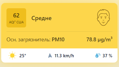 В 09:00 станция мониторинга в столице Узбекистана показывала результат в 62 AQI. Концентрация PM2.5 — в 2,4 раза выше рекомендуемого ВОЗ среднегодового значения качества воздуха.