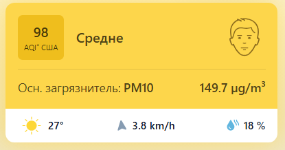 В 10:20 станция мониторинга в столице Узбекистана показывала результат в 98 AQI. Концентрация PM2.5 — в 5 раз выше рекомендуемого ВОЗ среднегодового значения качества воздуха.