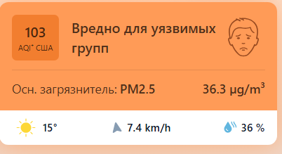 В 09:05 станция мониторинга в столице Узбекистана показывала результат в 103 AQI. Концентрация PM2.5 — в 7,3 раза выше рекомендуемого ВОЗ среднегодового значения качества воздуха.