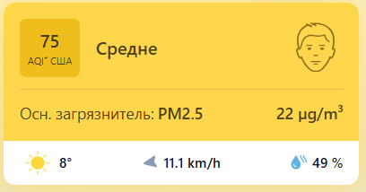 В 09:50 станция мониторинга в столице Узбекистана показывала результат в 75 AQI. Концентрация PM2.5 — в 4,4 раза выше рекомендуемого ВОЗ среднегодового значения качества воздуха.